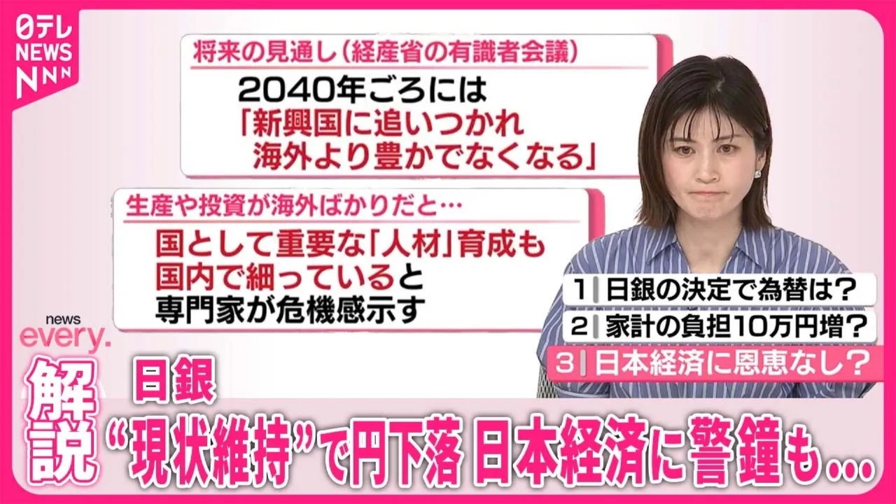 日本銀行は、金融政策決定会合で、現在の政策金利を据え置くことを決めました。日銀の発表を受け、「円安」が加速し、円相場は1ドル=156円台後半まで下落しました。歴史的な円安は、家計や中小企業を圧迫していますが、植田総裁は、いまの「円安」は基調的な物価上昇率に大きな影響は与えていないとの見解を示しました。 (2024年4月26日放送「news every.」より)