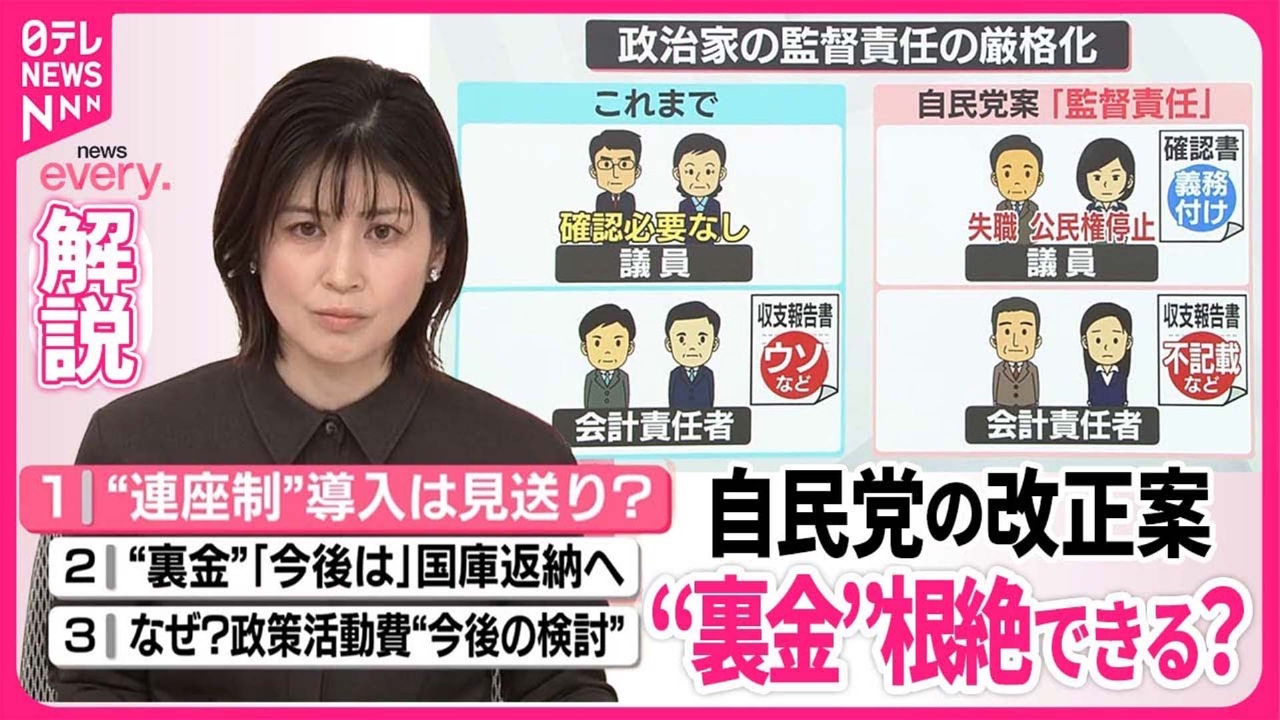 “裏金根絶”につながるでしょうか。裏金事件を受けて自民党が23日にまとめた政治資金規正法の改正に向けた案について24日、公明党との協議が行われました。自民党案のポイントを整理します。 (2024年4月24日放送「news every.」より)