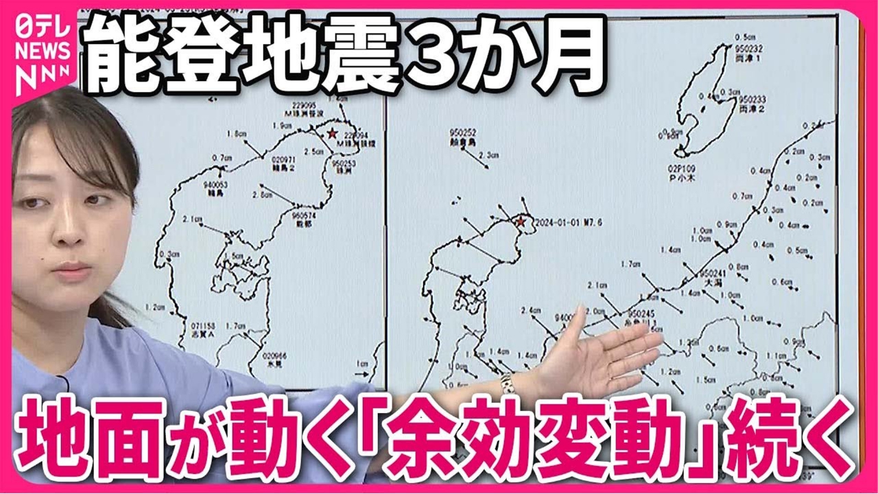 元日の能登半島地震から3か月あまり、能登地方やその周辺では、現在も活発な地震活動が続いています。マグニチュード7.6という大地震によって能登半島では大きな地盤隆起がおきましたが、実は、現在も地面がゆっくりと動き続けています。東日本大震災でも観測されたこの「余効変動」という現象は関東地方にも及んでいます。能登地方の最新の地震活動状況と、地面が動き続ける「余効変動」について社会部災害担当・内藤ミカ記者が解説します。【週刊地震ニュース】 (2024年4月15日放送)