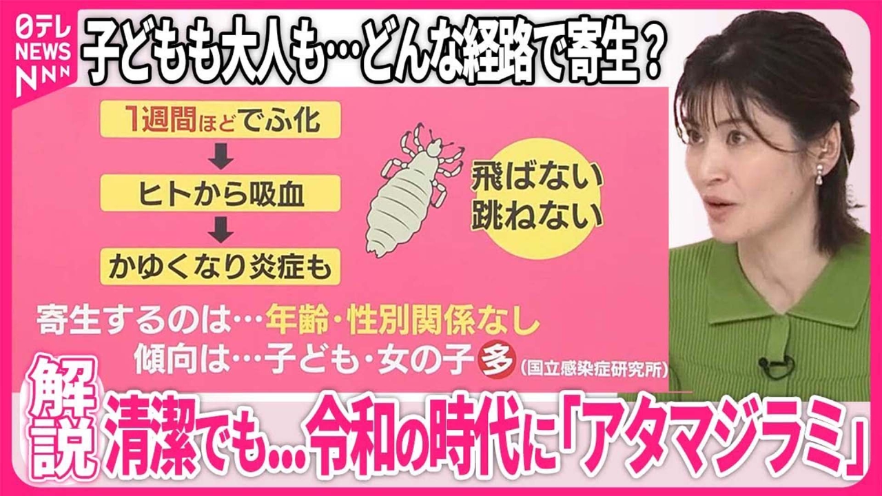 ヒトに寄生して血を吸う「アタマジラミ」。決して昔の話ではなく、令和の今、子どもたちの間でも感染が広がっています。髪を洗って清潔にしていても寄生し、子どもや女の子に多いといいます。子どもに見つかった当事者や医師に、体験談や対策を聞きました。(2024年5月7日放送「news every.」より)