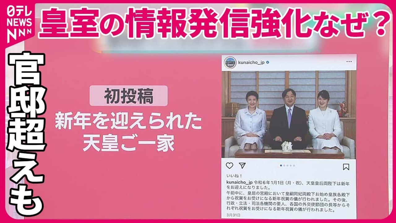 宮内庁は4月、公式インスタグラムを開設しました。日頃の皇室の活動に加えて裏側まで知ることができ、フォロワー数や閲覧数は好調です。一方でコメントは書き込めないよう設定するなど、バッシングのリスクも考慮しています。SNSを始めた背景を考えます。 (2024年4月9日放送「news every.」より)