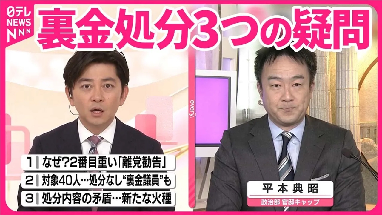 裏金問題の処分の調整が大詰めです。自民党は不記載額が500万円以上のおよそ40人を対象とする方向で調整しています。この処分をめぐる3つの疑問について、政治部の平本典昭官邸キャップと伝えていきたいと思います。 (2024年4月1日放送「news every.」より)