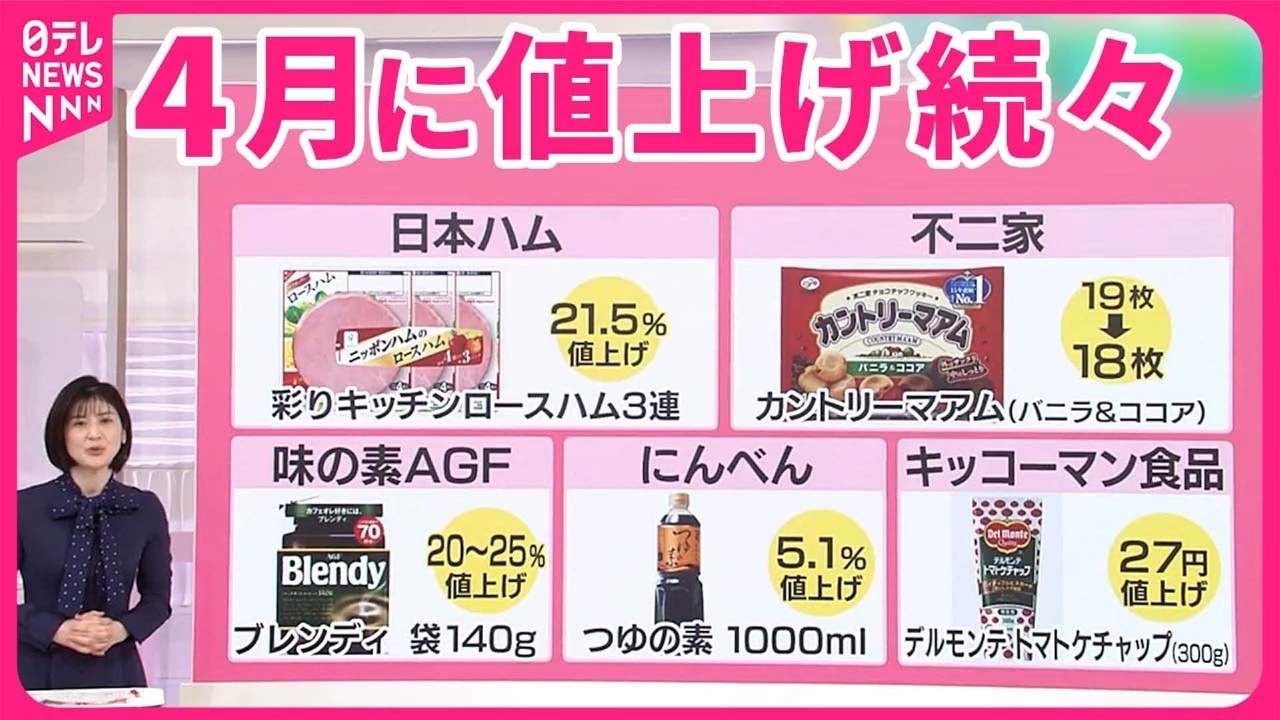 去年や一昨年に比べると小康状態だった、原材料高に伴う値上げ。ここに来て、再燃の兆しが見られるといいます。4月からは再び値上げラッシュとなり、食品や紙、宅配便などの値段が上がります。一方で、関東圏のバスや鉄道ではお得なサービスも始まります。 (2024年3月28日放送「news every.」より)