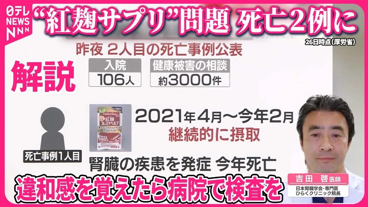 小林製薬の「紅麹原料」を含むサプリメントで健康被害が相次いでいます。摂取していた人が腎臓の疾患を発症し、死亡していたことも明らかになっています。日本腎臓学会の専門医である吉田啓医師に聞きました。 (2024年3月27日放送「news every.」より)