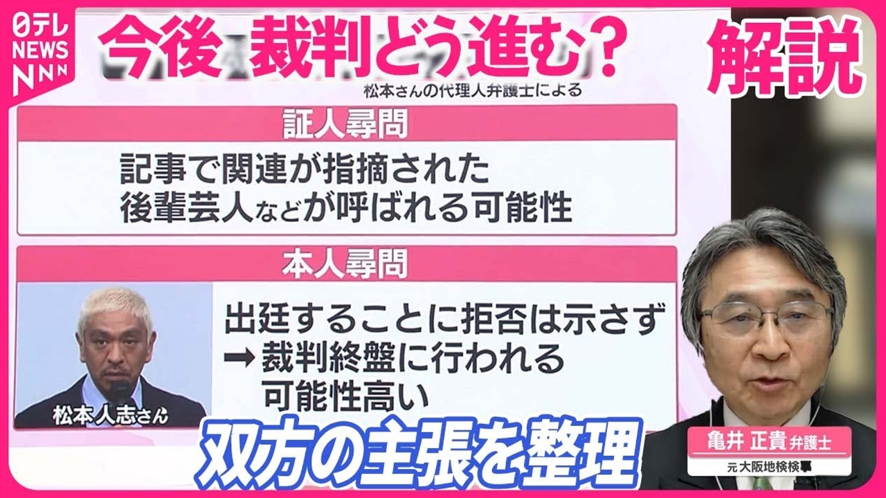ダウンタウンの松本人志さんが「名誉を傷つけられた」として、週刊文春側を訴えた裁判の第一回口頭弁論が28日に始まりました。松本さんと週刊文春は双方、どのように自身の主張を立証していくのか、元大阪地検検事の亀井正貴弁護士に話を聞きました。 (2024年3月28日放送「news every.」より)