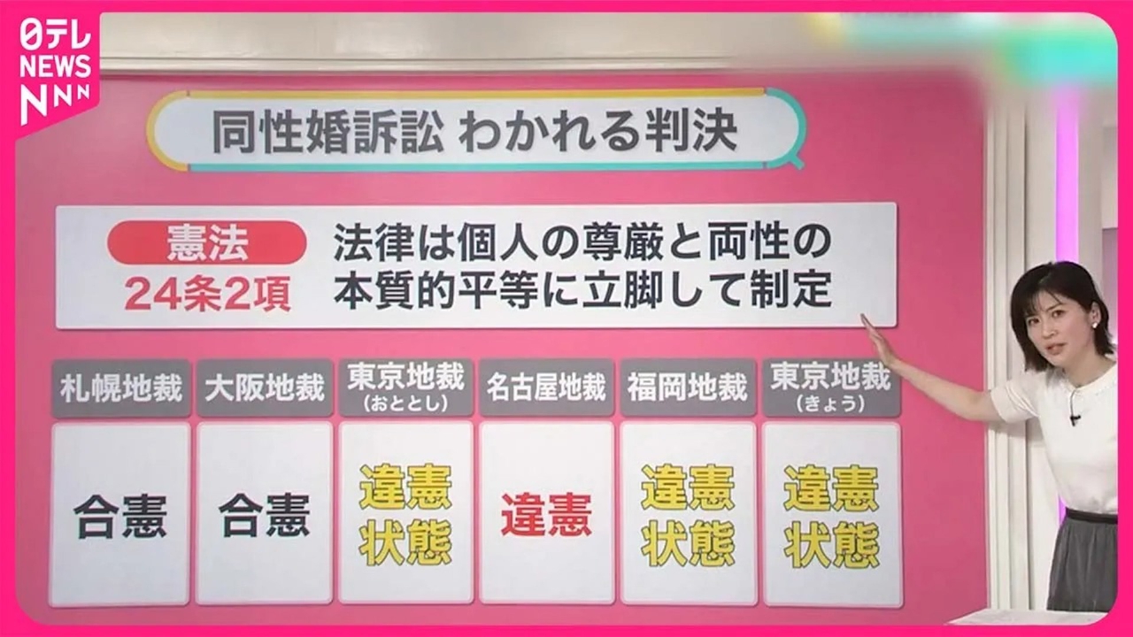 同性カップルの結婚が認められていないのは憲法違反だとして、全国で起こされた「同性婚訴訟」。14日に全ての地裁判決が出そろい、6件のうち違憲は1件のみでした。2審の札幌高裁でも同日、「違憲」としました。今、どんな流れにあるのでしょうか。そこで今回の#みんなのギモンでは、「同性婚訴訟…“違憲”相次ぐワケは?」をテーマに、次の2つのポイントを中心に解説します。 (2024年3月14日放送「news every.」より)
