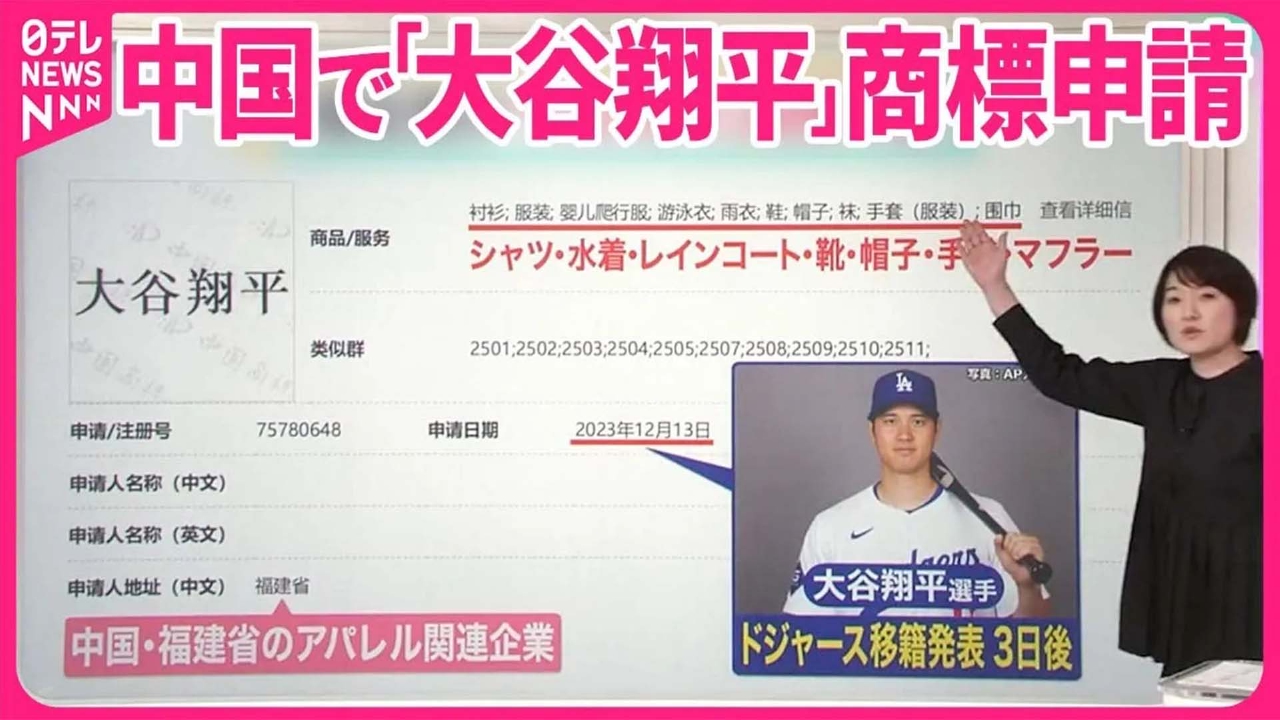 中国で「大谷翔平」の名前が商標申請されていることが分かりました。現地では大谷選手の知名度は高くなく、何が狙いなのでしょうか?他にも、申請中や登録済みになっている日本の著名人の名前があります。登録のメリットや審査のポイントを考えます。 (2024年2月28日放送「news every.」より)