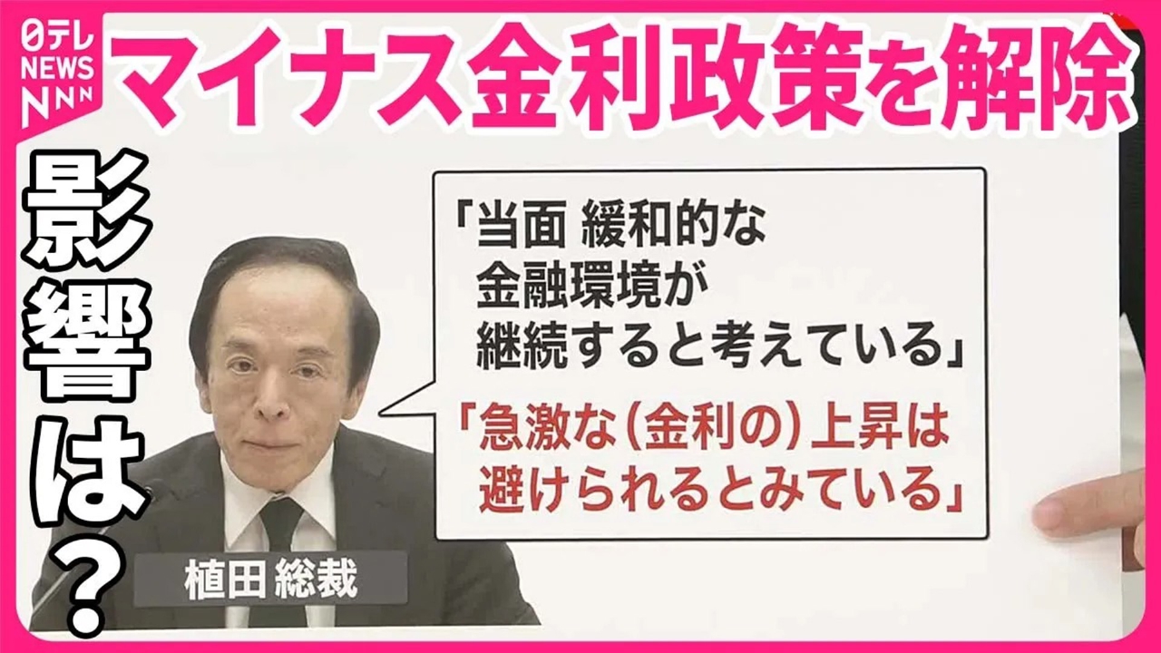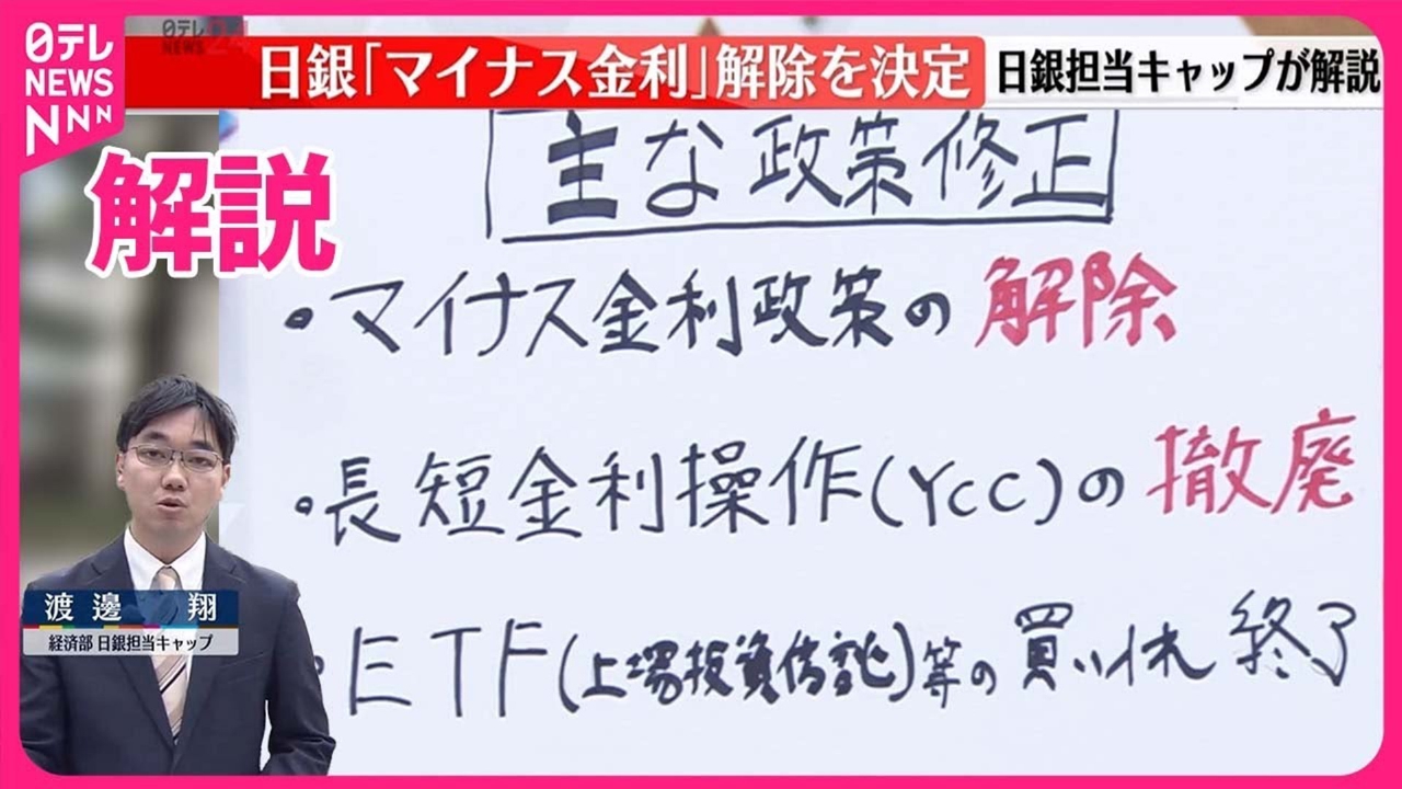 日本銀行は、19日の金融政策決定会合でマイナス金利政策を解除することを決定。17年ぶりの利上げに踏み切った。政策修正の詳しい内容と市場の反応は?日本テレビ・渡邊 翔 日銀担当キャップが解説する。 (2024年3月19日放送)