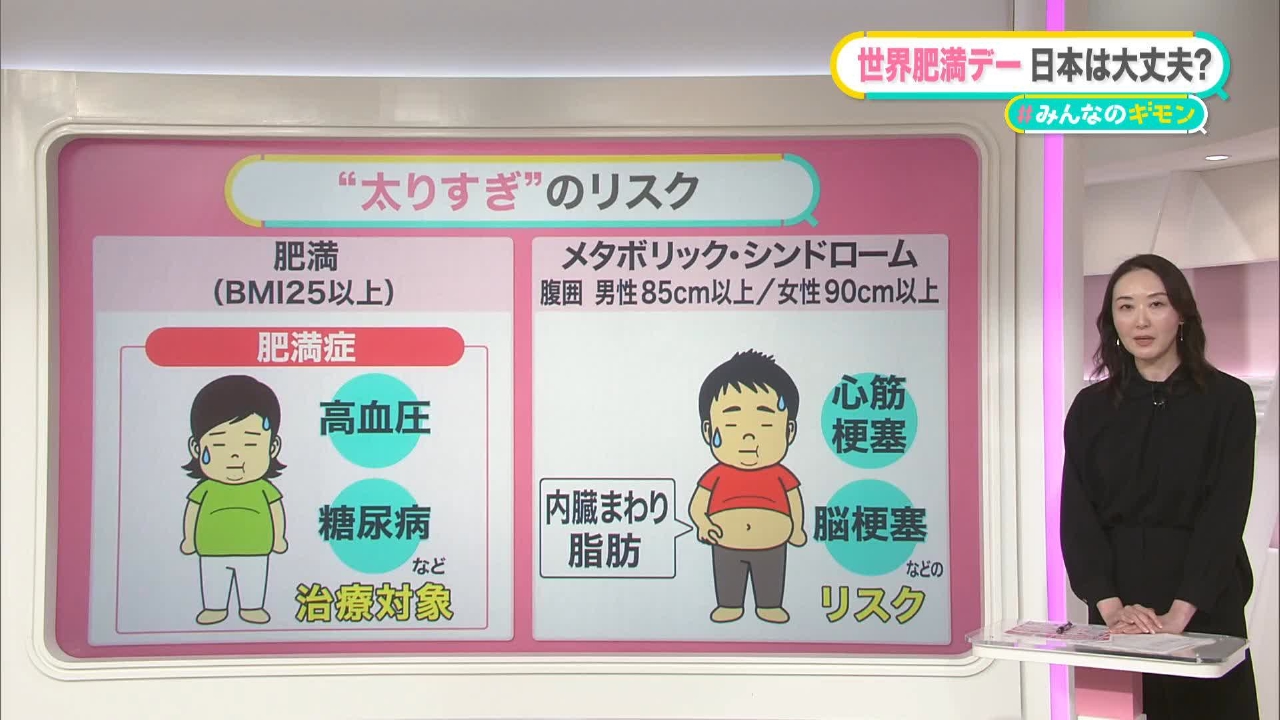 3月4日は「世界肥満デー」。ある研究によれば、世界では肥満の人が10億人を突破しました。日本でも急激に増えていて、医師によると成人男性や子どもに目立っています。肥満度の目安となるBMIの都道府県別の数値や、日本人ならではの特徴を考えます。 (2024年3月4日放送「news every.」より)