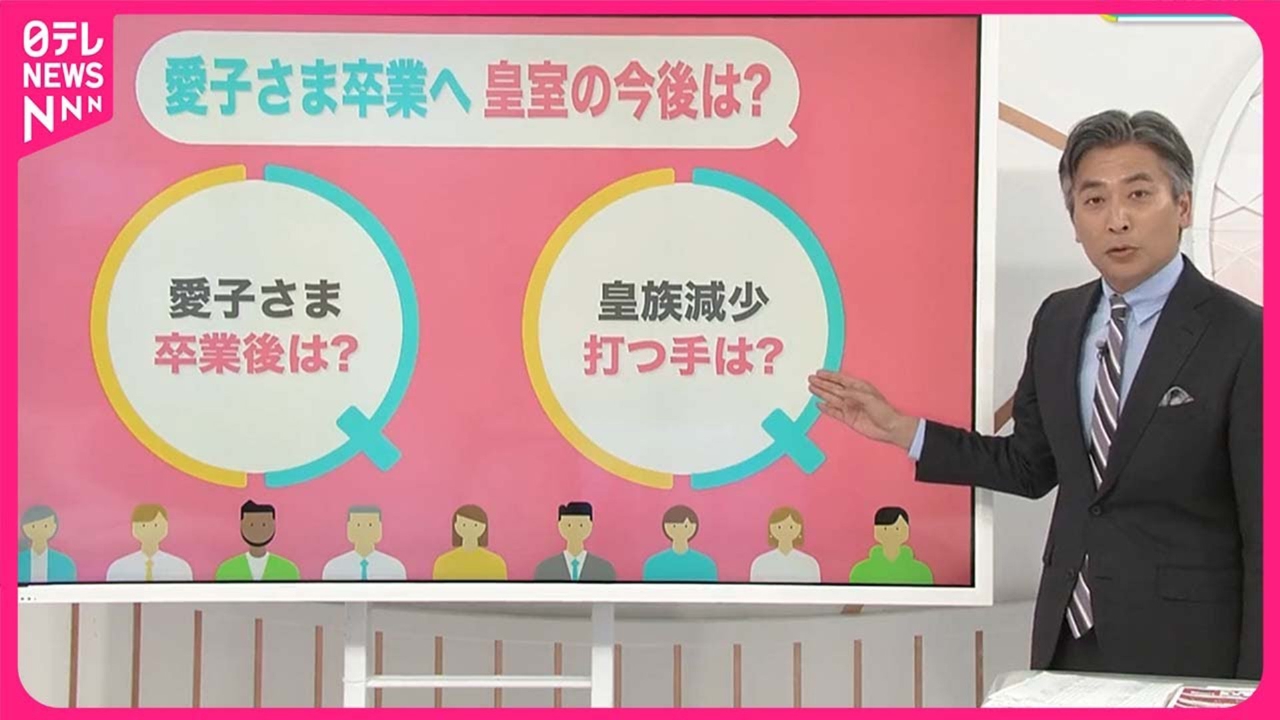 天皇皇后両陛下の長女、愛子さまは20日に大学を卒業されます。若い世代の皇族は、悠仁さまを除くと愛子さまを含め5人全員が女性。現在の制度では、女性皇族は結婚で皇族の身分を離れます。皇室の存続へ、国民的な支持が得られる策を議論することが急務です。そこで今回の#みんなのギモンでは、「愛子さま卒業へ 皇室の今後は?」をテーマに、次の2つのポイントを中心に解説します。 (2024年3月19日放送「news every.」より)
