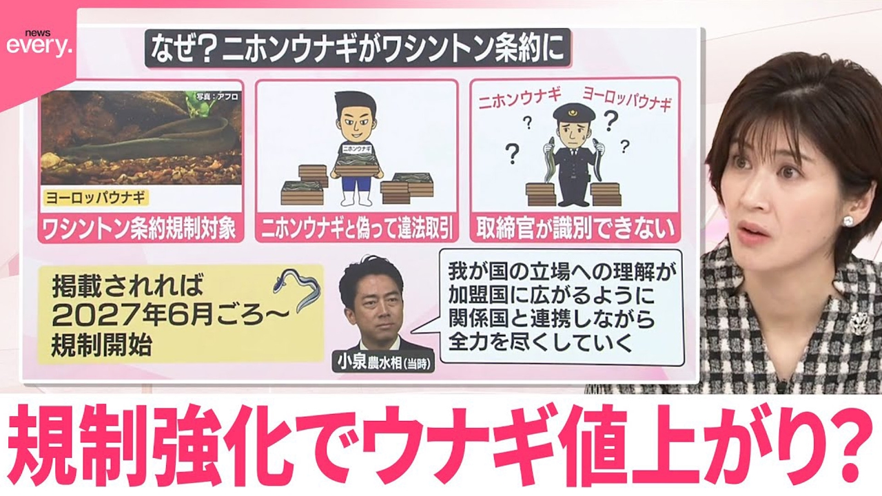 「news every.」の森圭介キャスターが、ニュースの気になる情報をお伝えする「なるほどッ!」。21日のテーマは、「規制強化でウナギ値上がり?」です。 (2025年10月21日放送「news every.」より)