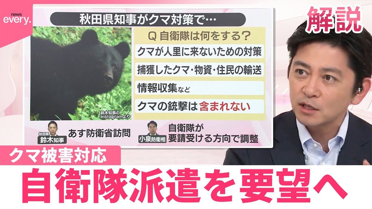 相次ぐクマ被害。秋田県はクマ対策での自衛隊派遣を防衛省に要望することを明らかにしました。今回の #みんなのギモン は「クマ被害対応 自衛隊も派遣?」をテーマに解説します。 (2025年10月27日放送「news every.」より)