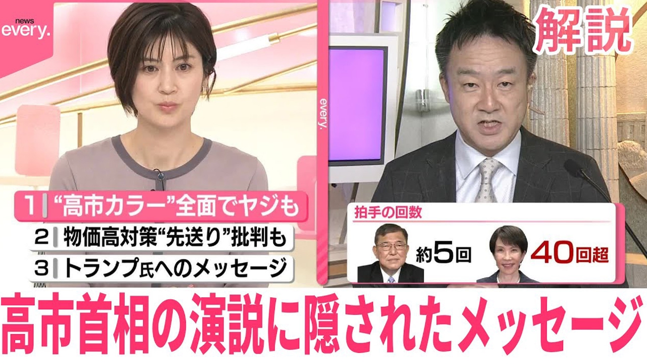 高市首相は24日の所信表明演説で、物価高対策を最優先で取り組むと強調しました。「世界の真ん中で咲き誇る日本外交を取り戻す」など、随所に“高市カラー”を打ち出しました。演説を現場で取材した日本テレビ政治部官邸キャップの平本典昭記者が、演説に隠された3つのメッセージを解説します。 (2025年10月24日放送「news every.」より)