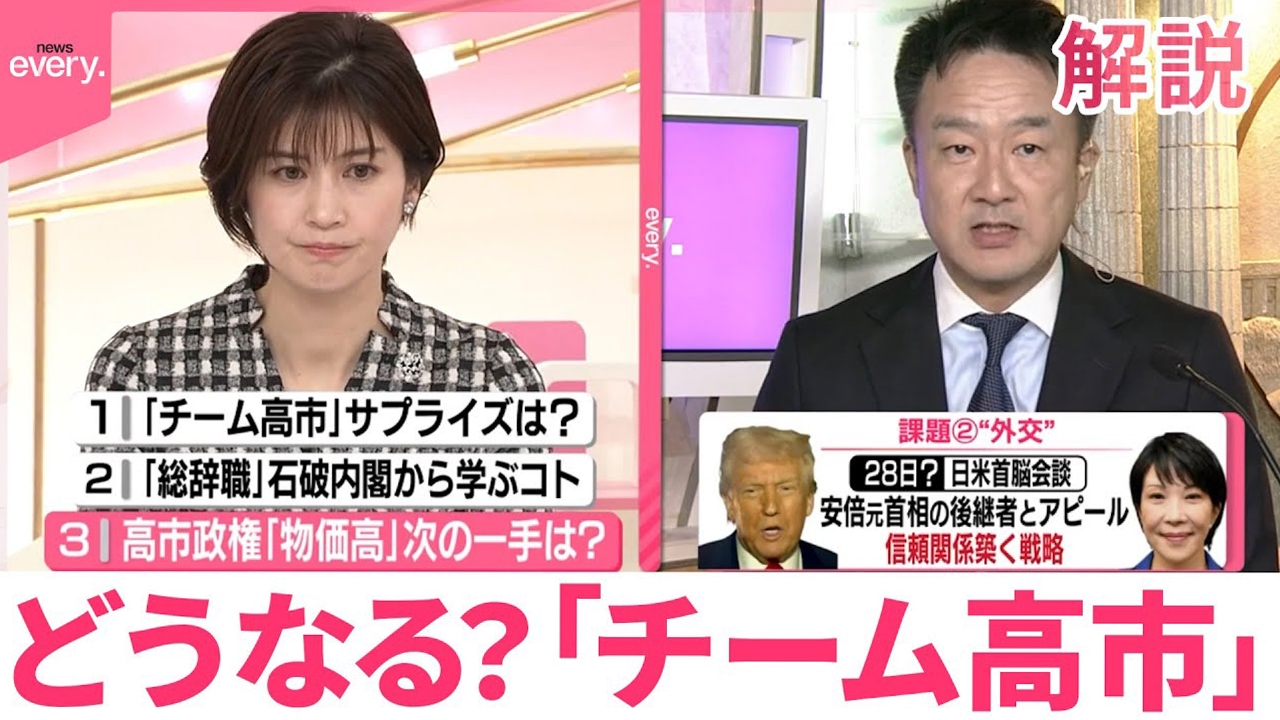 自民党の高市早苗総裁が第104代首相に選出されました。21日夜には高市内閣が発足することになります。人事で「驚かせる」と言っていた高市氏ですが「チーム高市」はどう受け止められているのか。日本テレビ政治部官邸キャップの平本典昭記者に3つのポイントで解説してもらいます。 1.「チーム高市」サプライズは? 2.「総辞職」石破内閣から学ぶコト 3.高市政権「物価高」次の一手は? (2025年10月21日放送「news every.」より)