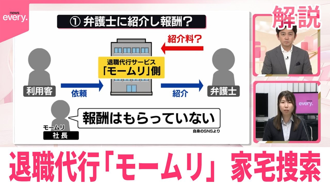 退職希望者の代わりに、勤務先に退職の意思を伝える退職代行サービス「モームリ」。その運営会社などに警視庁が家宅捜索に入りました。利用者に弁護士を、違法にあっせんした疑いがあるということです。日本テレビ・警視庁クラブ担当の関口絢子記者が解説します。 (2025年10月22日放送「news every.」より)