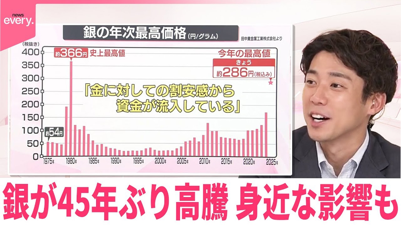 「news every.」の森圭介キャスターが、ニュースの気になる情報をお伝えする「なるほどッ!」。16日のテーマは、「銀が45年ぶり高値 身近な影響も」です。 (2025年10月16日放送「news every.」より)