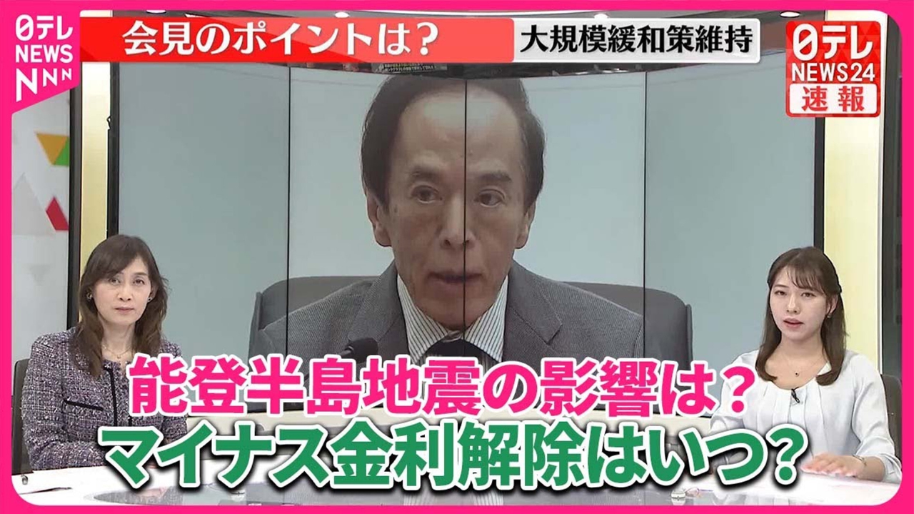 日本銀行は金融政策決定会合で、現在の大規模な金融緩和策の維持を決定。能登半島地震による影響は?そして、注目のマイナス金利解除はいつになるのか。経済部・宮島香澄解説委員が植田総裁の会見をもとに読み解く。(2024年1月23日放送)