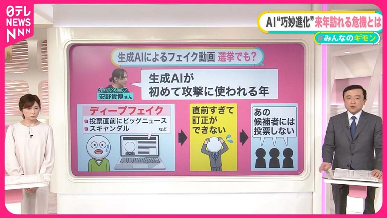 ウクライナ、ガザ地区での民間人への攻撃、自民党の派閥の政治資金をめぐる事件、大きなニュースが年を越します。そうした中、30日のギモンはいま世界的な問題となっている生成AIによるフェイク動画について、日本テレビ伊佐治健・報道局長が解説します。(2023年12月30日放送「news every.サタデー」より)