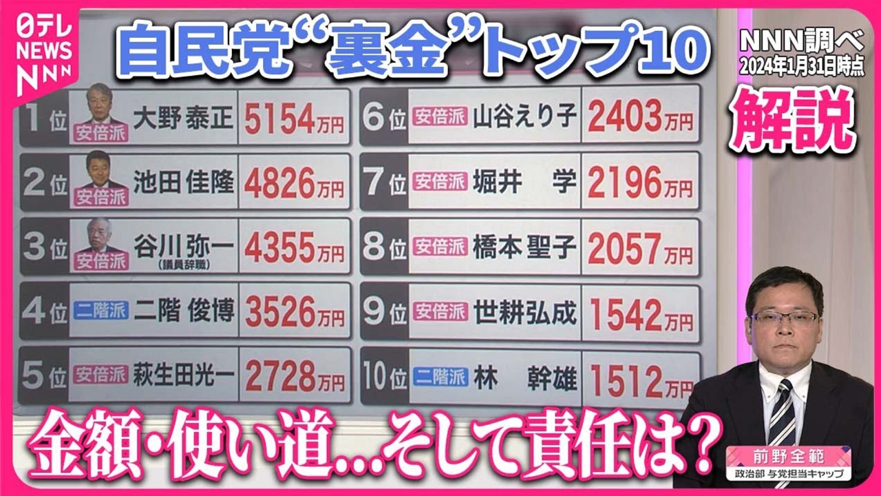 派閥の政治資金をめぐる事件を受け、安倍派は31日に収支報告書の訂正を届け出ました。NNNは独自に取材し、裏金を受け取っていた自民党議員とその金額をリスト化しました。日本テレビ政治部・与党担当キャップの前野全範が解説します。 (2024年1月31日放送「news every.」より)