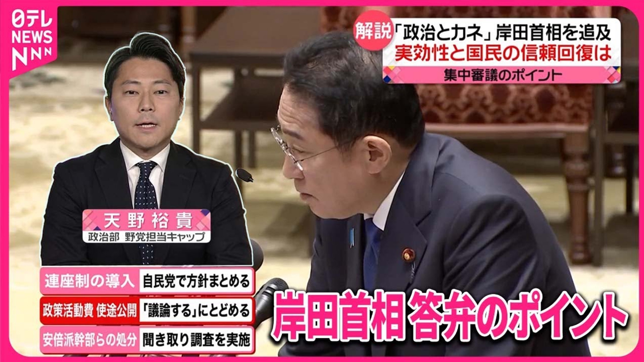 「政治とカネ」をめぐる29日の国会での集中審議で、岸田首相が答弁した主なポイントはこの3つです。 連座制の導入 :自民党で方針まとめる 政策活動費 使途公開:「議論する」にとどめる 安倍派幹部らの処分 :聞き取り調査を実施 (2024年1月29日放送「news every.」より)