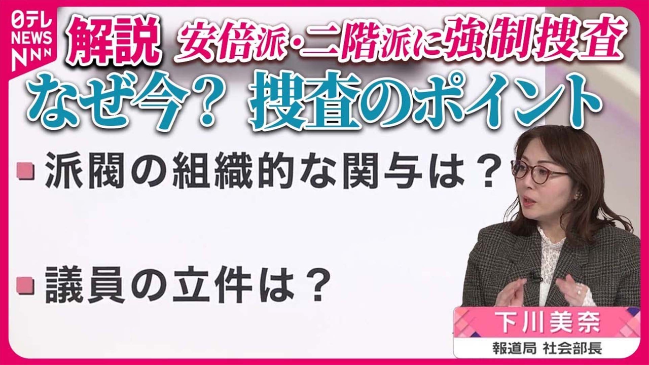 自民党の派閥の政治資金パーティーをめぐる問題で19日、東京地検特捜部が安倍派と二階派の事務所に強制捜査に入りました。今後の捜査のポイントにあげられるのは、「派閥の組織的な関与は?」「議員の立件は?」の2つです。日本テレビ報道局社会部の下川美奈部長が解説します。(2023年12月19日放送「news every.」より)
