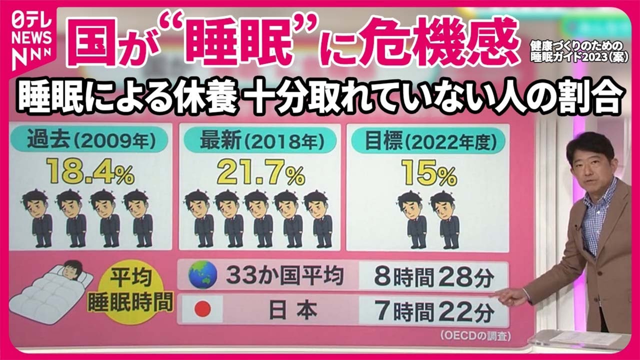 このたび、厚生労働省の検討会が、健康のために睡眠時間などは“こうあるべき”と世代ごとに指南する「睡眠ガイド」をあらたにまとめました。同様のガイドは以前にもありましたが、今回10年ぶりに見直されました。なぜ見直したかというと、日本人の睡眠が年々悪化しているからです。 (2023年12月22日放送「news every.」より)