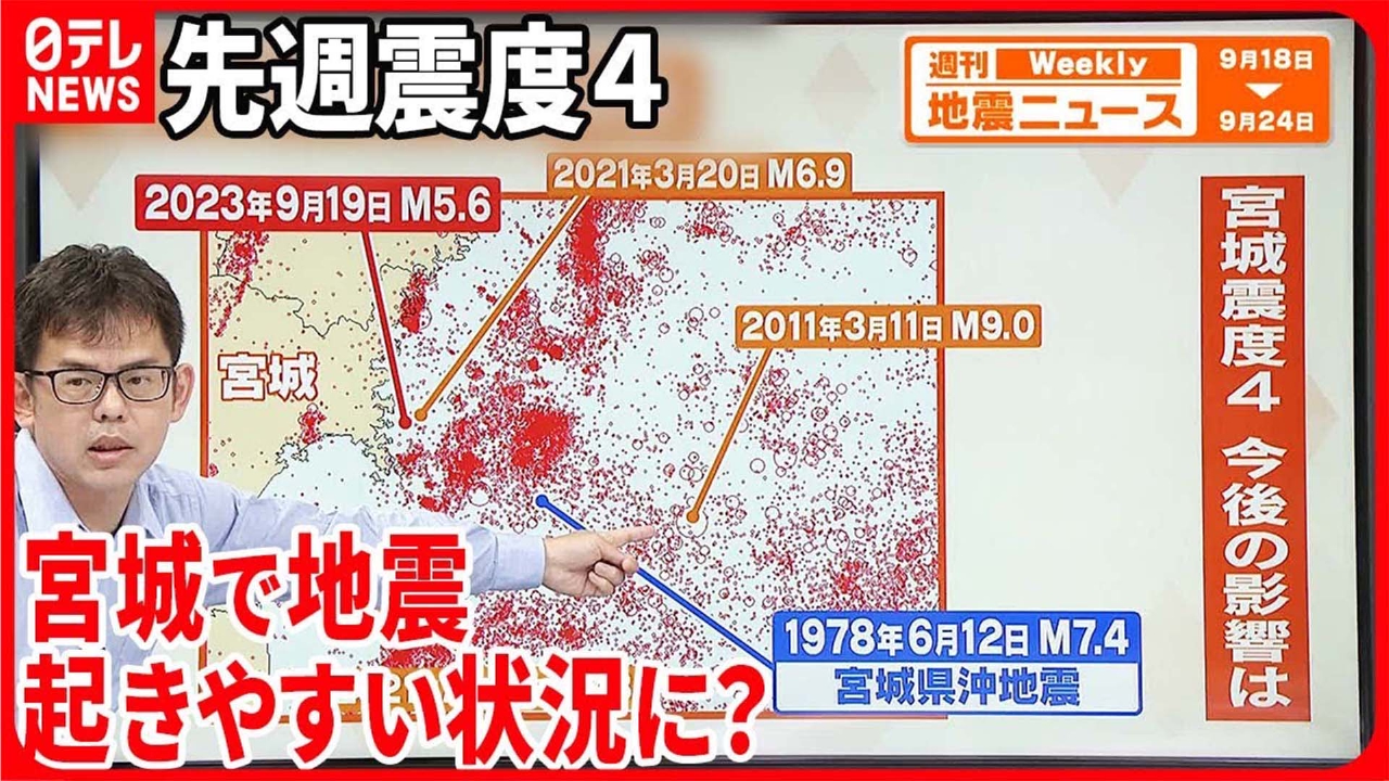 19日には宮城県沖を震源とする地震があり、震度4の揺れを観測しました。震源となった宮城県沖は、周期的に大きな地震が発生しているエリアですが、2011年の東日本大震災によって、地震活動が変化したという指摘もあります。社会部災害担当・中濱弘道デスクが解説します【週刊地震ニュース】 (2023年9月25日放送)