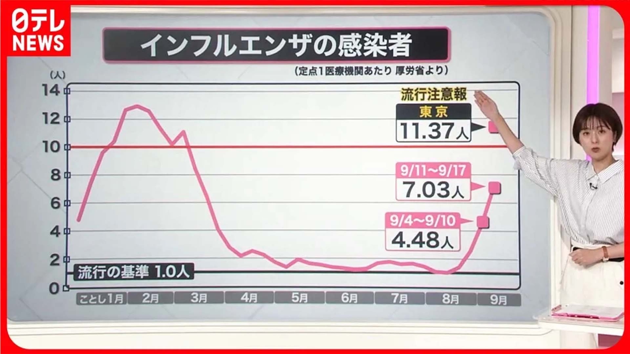 インフルエンザの感染者数が急増しています。全国の定点医療機関から報告された、1医療機関あたりの1週間の季節性インフルエンザの感染者数を表した今年のグラフを見ると、最新の9月17日までの1週間の感染者数は7.03人。前の週の4.48人の約1.57倍となりました。 (2023年9月25日放送「news every.」より)