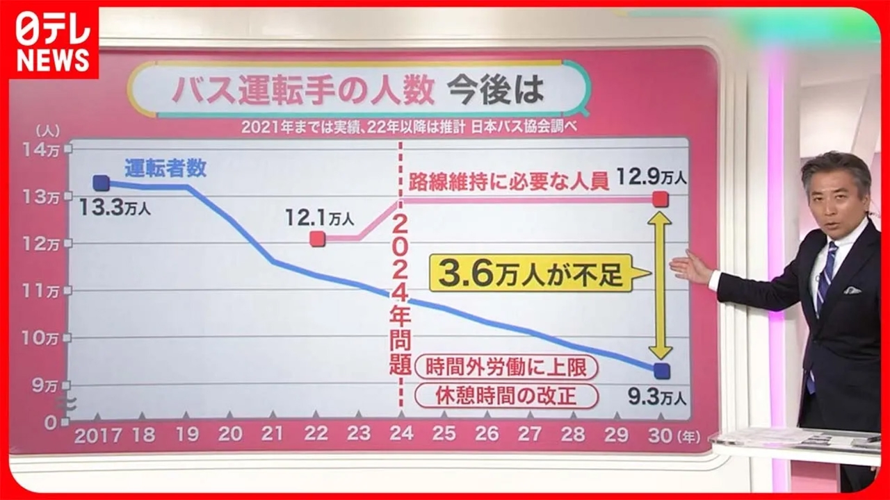 今、運転手不足により、各地の路線バスが危機にひんしているといいます。危機的状況が有事ではないのに発生しているというのがポイントです。次のポイントを中心に詳しく解説します。 ●3万6000人が不足…なぜ増えない? ●「このままではヤバい」訴えたバス会社 (2023年10月9日放送「news every.」より)
