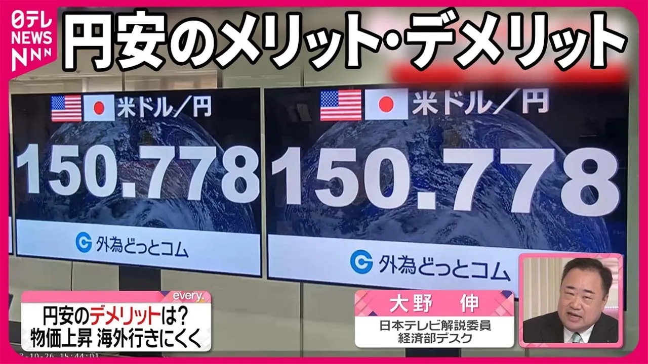 26日、外国為替市場で円相場が一時、1ドル=150円70銭台まで下落し、約1年ぶりの円安ドル高水準となりました。日本で暮らす人にも影響がある「円安のメリット・デメリット」について、日本テレビ経済部の大野解説委員とお伝えします。 (2023年10月26日放送「news every.」より)