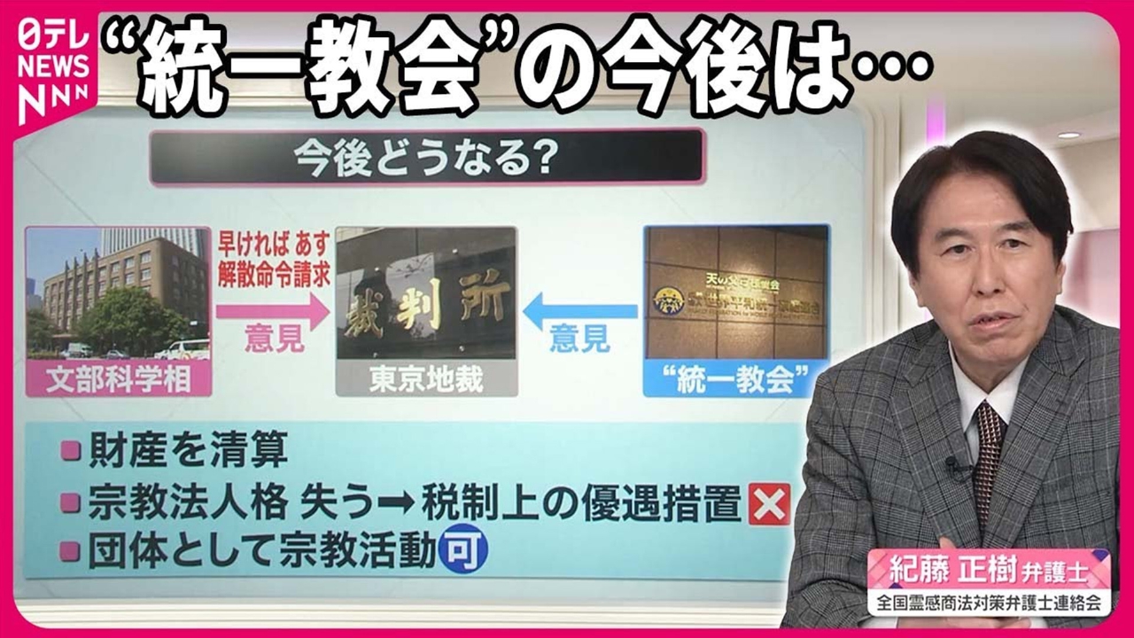 政府は、いわゆる“統一教会”に対する解散命令を東京地裁に請求することを正式に決定しました。13日にも請求するとしています。「全国統一教会被害対策弁護団」の副団長を務める紀藤正樹弁護士と、両親が教団の信者で、自身も元信者の「もるすこ」さんに、今回の決定をどう受け止めたのか、今後の行方はどうなるのかを聞きました。 (2023年10月12日放送「news every.」より)
