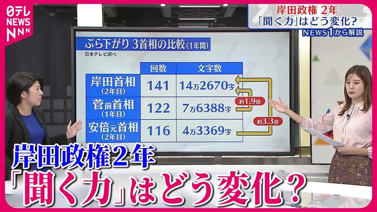 「聞く力」を掲げて発足した岸田政権。先週3年目に突入しましたが、その「聞く力」は十分に発揮されていたといえるのでしょうか。日本テレビは、報道対応や国民との対話という視点で、岸田首相の「聞く力」を客観的な数値で分析。その結果を、政治部・本岡記者がイチから解説します。 (2023年10月13日放送)