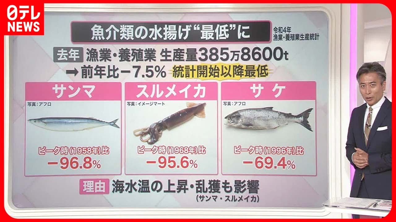 今、日本では魚介類の水揚げ量が減り続けていて、去年は過去最低となりました。背景には何があるのでしょうか。 ●食卓の定番が“激減” ●終わり見えない「大蛇行」 ●今後は「魚種転換」 以上のポイントを中心に詳しく解説します。 (2023年6月12日放送「news every.」より)
