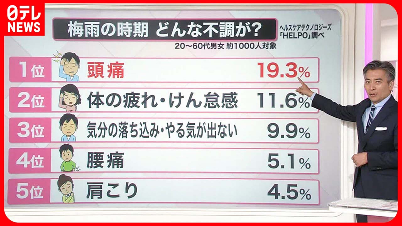 8日、関東甲信地方が梅雨入りしました。心も体も不調になりやすいこの時期をどのように乗り切ればよいのでしょうか。 ●今年の梅雨は長いかも? ●梅雨に不調…1位は ●原因は気圧の変化 以上のポイントを中心に詳しく解説します。 (2023年6月9日放送「news every.」より)