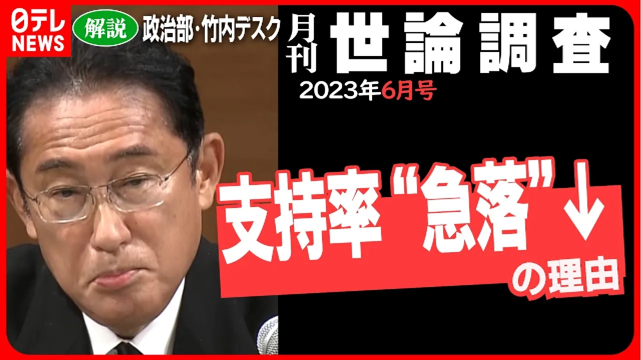 岸田内閣の支持率が前回5月の調査と比較してマイナス15ポイントと急落しました。ここのところ回復傾向にあり、しかも前回は56%と好調であったにもかかわらず、いったい岸田政権に何が起きたのでしょう?日本テレビ政治部の竹内デスクと菅原解説委員の同期コンビが徹底解説します。 (2023年7月1日放送)