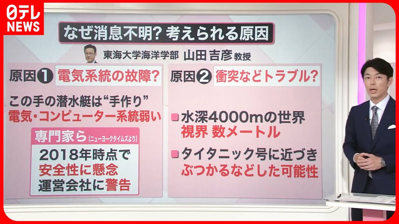 海底に沈む「タイタニック号」を見に行くツアーの潜水艇「タイタン」が消息不明になって間もなく丸4日となります。 (2023年6月22日放送「news every.」より)