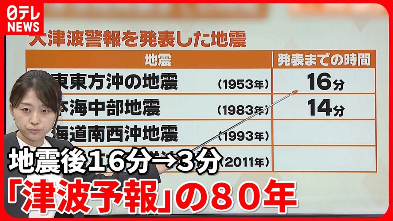 1941年から開始した「津波予報」。当時、予報の対象は三陸沿岸に限られていました。その理由とは?度重なる津波被害を経験する度に気象庁は予測技術の開発・改善に取り組んできました。大津波警報を発表した巨大地震の事例、そして地震発生後約3分で津波情報を発表できるまでに至った取り組みを社会部災害担当・内藤ミカ記者が解説します。【週刊地震ニュース】 (2023年6月26日放送)