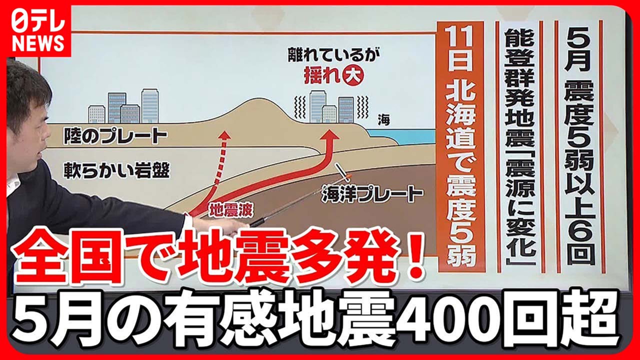 11日夕方、北海道浦河沖を震源とする地震で震度5弱を千歳市などで観測しました。この地震では東北、関東、東海地方の広範囲で揺れを観測、震源深く「異常震域」が発生したものとみられます。5月は震度5弱以上が6回発生、「偶然」なだけなのか? 過去にも短い期間に強い地震が相次ぐ事例も。社会部災害担当・中濱弘道デスクが解説します。【週刊地震ニュース】 (2023年6月12日放送)