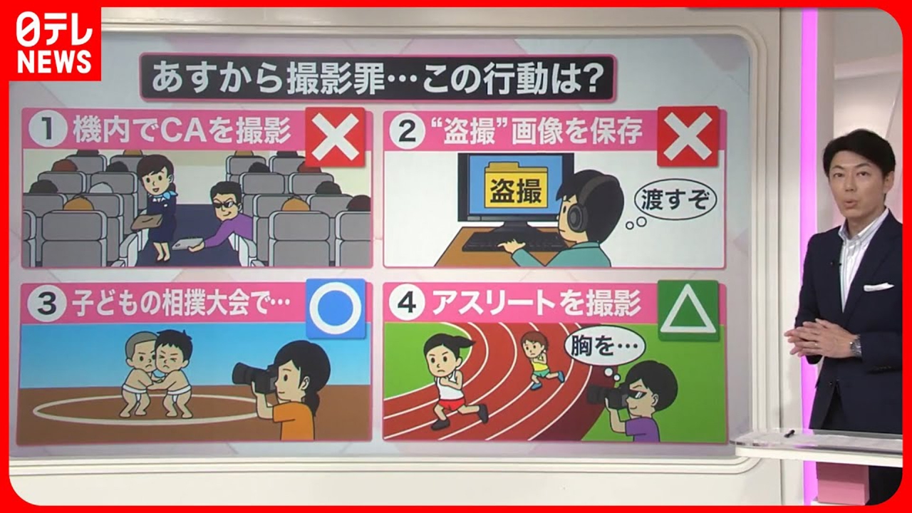 隠し撮りからさらにエスカレートした「盗撮」について、13日から新たな法律が施行され「撮影罪」として処罰されることになります。どんな行為が撮影罪にあたるのか、いくつかケースを見ていきます。 (2023年7月12日放送「news every.」より)