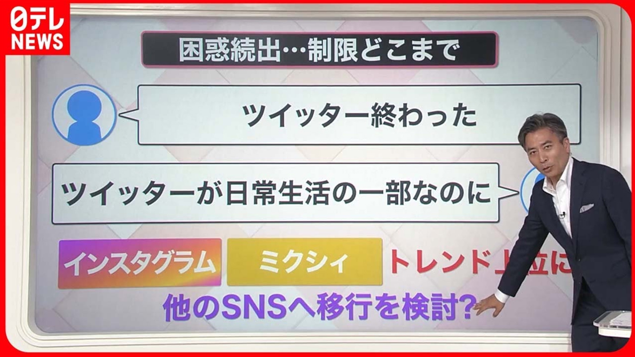ツイッターのオーナーであるイーロン・マスク氏は、ツイッターの利用者が閲覧できる投稿の数を一時的に制限しました。1日から(閲覧した投稿数の上限に達し)ツイッターが急に見られなくなった人が出ているそうです。 ◇困惑続出…制限どこまで ◇なぜ? マスク氏の「狙い」 以上の2点について詳しくお伝えします。 (2023年7月3日放送「news every.」より)
