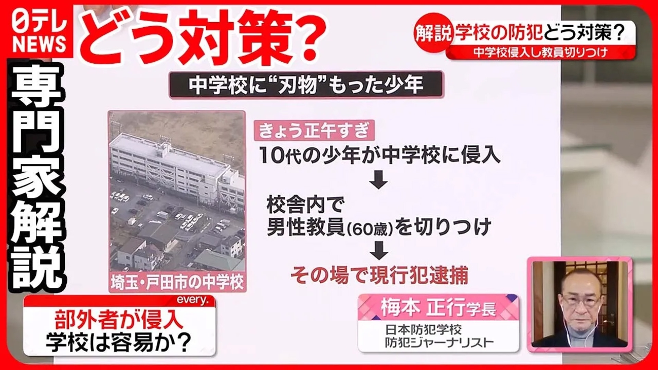 1日正午過ぎ、10代の少年が埼玉県・戸田市の中学校に侵入し、60歳の男性教員を刃物のようなもので切りつけました。少年はその場で現行犯逮捕されました。校舎内への侵入を防ぐためにはどのような対策が必要なのでしょうか?専門家に聞きました。(2023年3月1日放送「news every.」より)
