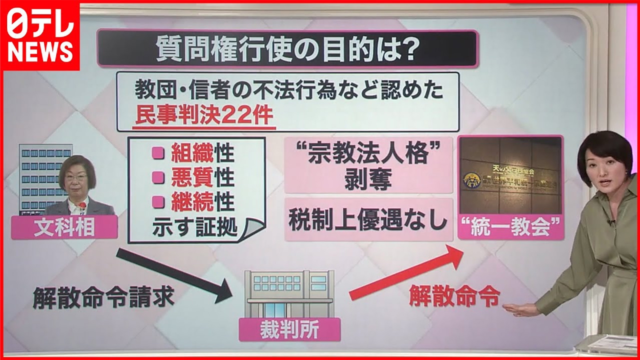 世界平和統一家庭連合、いわゆる“統一教会”の調査について、政府が本格的に着手しました。 ◇前例のない「質問権」 ◇養子縁組745件 ◇救済新法「役に立たない」の声も 以上の3点について詳しくお伝えします。(2022年11月22日放送「news every.」より)