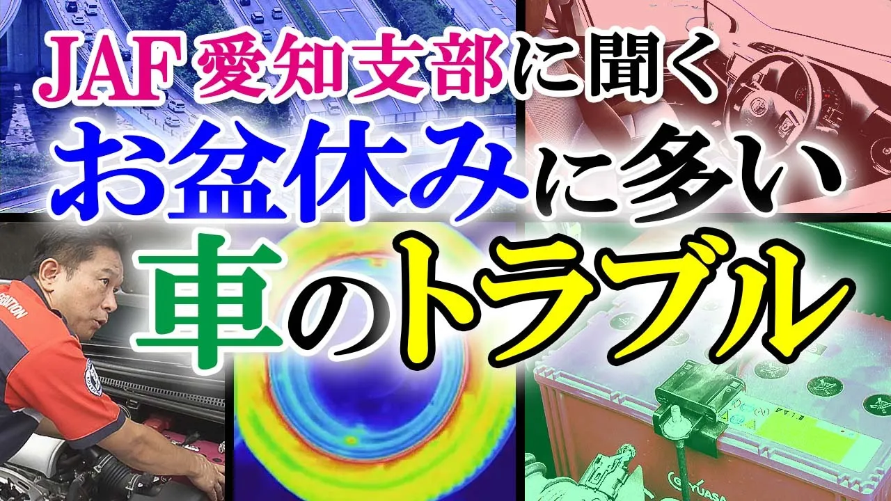 明日からお盆休み、車で出かけるという方、必見です。暑い、お盆中に起きやすい車のトラブルというものがあるそうなんです。竹田基起アナウンサーがJAFに聞きました。 今年のお盆休み、車でお出かけする方気を付けてください。この時期は、車のトラブルが起きやすいというのです。 その理由をJAF愛知支部の武藤さんに聞きました。 Q. お盆休みの車のトラブルは多い?(竹田基起アナウンサー) 「人出も増えるため全体的に救援要請件数も増加する。“バッテリー上がり”のトラブルが多い」(JAF愛知支部 武藤敏行さん) 7月、愛知県でのバッテリーのトラブルは6000件を超えていて、8月はこの数を上回る可能性があるといいます。 Q.夏の時期にバッテリー上がりが多い理由は?(竹田アナウンサー) 「夏の時期はエアコンをよく使う」(JAF愛知支部 武藤さん) Q.エアコンでそれだけバッテリーを使う?(竹田アナウンサー) 「エンジンの回転が低い渋滞で発電量よりもエアコンの電力が増え、“バッテリー上がり”につながる」(JAF愛知支部 武藤さん) そんな“バッテリー上がり”ですが、あることをすると大半は防げるといいます。 「日常の点検が一番の対策」(JAF愛知支部 武藤さん) 重要なのは「日ごろの点検」。ではどのように点検したらよいのでしょうか? 「自宅でも出来る方法はしっかりと取り付けられているか」(JAF愛知支部 武藤さん) Q. 運転していて緩んでくる?(竹田アナウンサー) 「ネジが緩むとグラグラする。本体が揺れると端子自体も緩むことがある」(JAF愛知支部 武藤さん) バッテリーを固定しているボルトは、運転していると振動で緩んでくることがあるそうです。 グラグラ動いてしまうと端子にしっかり電気が流れず、“バッテリー上がり”の原因になるといいます。 バッテリーの寿命は2年から5年なのでバッテリーチェッカーで電圧、中の液体が十分かどうか状態を調べておくことも重要だといいます。 Q. ガソリンスタンドにバッテリーチェッカーはない?(竹田アナウンサー) 「整備をする所にはあるが、給油しか行わない場合もあるため事前に確認が必要」(JAF愛知支部 武藤さん) 続いて、この時期に気を付けないといけないのがタイヤです。 Q.この時期にタイヤトラブルが多い理由は?(竹田アナウンサー) 「使用年数とともにゴムの質の低下。空気圧が低い状態で使うと、タイヤが発熱しパンクにつながる。夏は路面温度も高いため、タイヤの温度も上がりやすい」(JAF愛知支部 武藤さん) JAFが行ったタイヤのバーストについての実験では、正常な空気圧のタイヤよりも空気圧の低いタイヤの方が地面に接している部分が広くなります。 サーモカメラで見てみると、地面との摩擦が大きい分、空気圧の低いタイヤには熱がこもることがわかります。 さらにこの時期の路面が相当熱くタイヤの劣化が進みやすいため、パンクに至るといいます。 Q.タイヤの空気はどれくらいが良い?(竹田アナウンサー) 「各車種に決まった空気圧が記載してある」(JAF愛知支部 武藤さん) 国産車の場合は運転席のドアの淵にタイヤの空気圧が記されています。 ガソリンスタンなどで空気入れは借りられるのでお出かけ前にチェックしてください。 今の時期、直射日光が当たる場所に車を止めておくと車内温度は60℃に達することもあります。 そんな熱い車内をJAFが3つの方法で冷す実験をしました。 (1)助手席の窓を開け運転席のドアを5回開閉し、車内の暑い空気を外へだす。 (2)エアコンの温度を最も低くし、風量は最大、加えて、外気循環モードにする (3)エアコンは先ほどと同じ条件で内気循環モードする この3通りの方法で55℃の車内を冷やしました。 (1)の方法ではすぐに47.5℃になりましたが、それ以上は下がらず。 (2)の外気循環・(3)の内気循環の方法ではそれぞれ29.5℃、27.5℃と涼しくなりましたが、その温度に至るまでに10分かかりました。 こうした実験を経て効率よく車内を冷やす方法を編み出したといいます。 「まずは車に乗り込んで窓を全開にする。外気循環モードにして、エアコンの気温は最低温度にして、風量は最大にして、出発しましょう。走ることで内気と外気が入れ替わる」(JAF愛知支部 武藤さん) この方法では、55℃だった車内がたった2分で28℃まで下がったといいます。