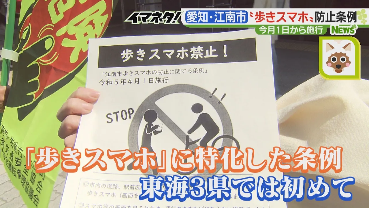 新年度と共に愛知県江南市で始まったのが「歩きスマホ防止条例」です。歩きスマホに関する条例は東海3県で初めて。島津咲苗アナウンサーが現場を取材しました。 「名鉄江南駅前です。警察官らが歩きスマホの禁止を呼びかけるチラシを配っています」(島津アナ 3日) 4月から始まった「歩きスマホの防止に関する条例」。条例では市内の道路や駅前広場、公園などでの歩きスマホを禁止し、操作する場合は通行の妨げにならない場所で、立ち止まって行うよう求めています。 4月3日、江南駅や商業施設がオープンしたばかりの布袋駅の前では、市の職員や警察官らが啓発活動を行っていました。市の担当者に話を聞きました。 Q.歩きスマホを禁止する条例は東海3県では初めてですが、制定の背景は?(島津アナ) 「全国的にも交通事故や交通障害の事例が多発していて、江南市としても危険視していました」(江南市 防災安全課 大矢幸弘さん) Q.罰則はありますか? 「罰則は基本的にはありません」 Q.罰則がない中、どういった効果を期待しますか? 「歩きスマホは危険だという事を認識していただきまして、安全安心な公共の場所を歩ける状況を提供していけるといいなと思っています」 愛知県によると去年、県内では「歩きスマホ」が原因の交通事故で25人がケガをしていて、過去5年間で増加傾向が続いているといいます。 また、こんなデータもあります。MMD研究所が、歩きスマホについて行ったアンケートによると、「危ないと思う」が61.7%、「やや危ないと思う」」が29.2%、合わせて90.9%の人が「危ない」と回答しました。 しかし「危ないと思う」「やや危ないと思う」と回答した人は、2019年の同様の調査と比較すると5.7ポイント減少。年々、危機意識が低下の傾向にあるという結果が出ています。 駅周辺にいた人たちに聞いてみました。 Q.歩きスマホが禁止される条例のことは知っていましたか? 「なんとなくは聞いていたんですけど…この辺はよく歩くので警察の方とかが言っているので」 Q.ご自身でヒヤッとした経験は? 「あまり自分では感じないですけど、歩きではなく自転車に乗ってスマホをいじっている人にぶつかりそうになったことは何度かあります」 Q.ヒヤッとした経験は? 「子どもがスマホを使うようになって、もう夢中になっているので、すごい気になりますよね」 Q.歩きスマホの禁止がルール化されることについては? 「いいと思います。無意識にやってしまっていることなので。罰則となると厳しいと思いますが、誰かに肩をトントンと注意されれば、それで事故が減るのであればいいことかなと思います」 Q.条例の施行から初めての土日(1日・2日)も過ぎましたが呼びかけの効果は? 「日にちが浅くて、はっきりとした効果の検証はまだできていません。ただチラシを江南駅や布袋駅で配布させていただいたりとか、そういったことの効果が検証で明らかになってくれればいいと思います」(江南市 防災安全課 大矢幸弘さん) 歩きスマホによる危険性は…愛知工科大学の小塚一宏教授の協力で行われた、スマホ操作時の目線がどうなっているかを調べる実験の様子(2014年)です。 人が行き交う中で「歩きスマホ」をしていると、目線の動きを表す白いマークは、一瞬上下に動きますが、ほとんどスマホの画面から動いていません。マークを線で表すと、スマホを見ていない時と比べ、左右には一切動いていないことがわかりました。小塚教授は「歩きスマホ」をすると視野は20分の1ほどに狭まるとしてしています。 Q.他の自治体にもスマホ禁止は広がっていくと思いますか? 「江南市の今後の検証結果などが出てくると、必要性が改めて認識される可能性もあります。そうなると全ての市町村で取り入れられる可能性はあるかと思っています」(江南市 防災安全課 大矢幸弘さん)