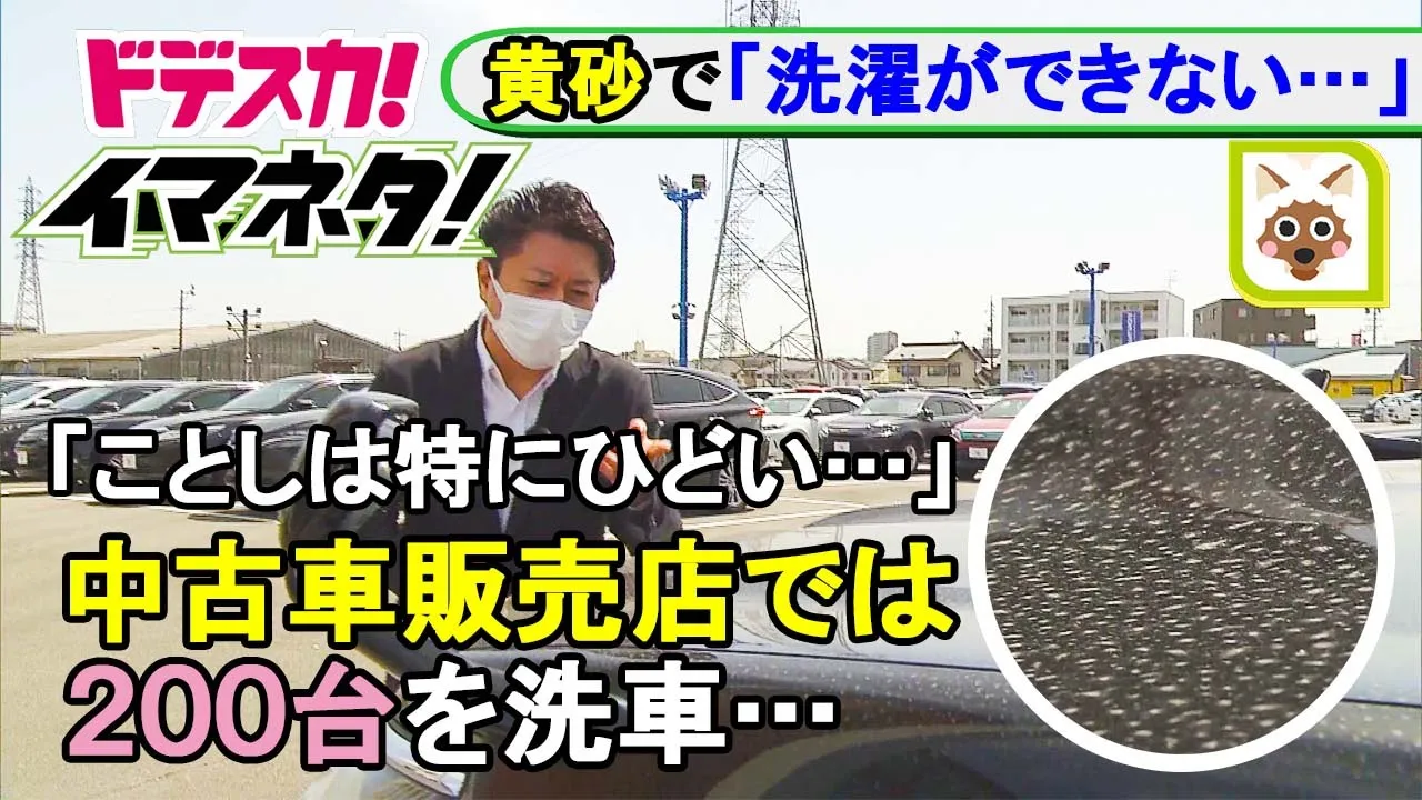 4月13日、大陸からの黄砂が日本の広い範囲で確認されました。影響は東海地方でも…大変だったのは屋外に13日午前8時半ごろの名古屋市内の情報カメラの映像は黄砂の影響でしょうか、遠くの方がかすんでいます。岐阜市の金華山から見た街は奥に行くにつれて見通しが悪くなっています。愛知県田原市の情報カメラの映像も空全体がかすんでいました。 名古屋の中心部、栄にあるバス停の透明な仕切り板には、黄砂とみられる細かい黄色い粒が大量に付着していて、ティッシュで拭くとティッシュにも付着しました。通行している方に話を聞くと… 「きょうは洗濯はしない。干してから花粉を払ってなんてやるくらいなら、あした選択すればいいから」「車は汚れていました。白い車だから洗車しなきゃ」 名古屋市中川区にあるコイン洗車場では、黄砂による汚れが気になる人が多いようで、13日は洗車をしにくる人が多数いました。鮮やかな赤色のボディに、べったりと黄砂がつき汚れてしまった人は… 「(洗車は)面倒くさいは面倒くさいですが、塗料など傷んだりするのも嫌ですし、まだ車も買ったばかりなので、できるだけ大切に洗いたいという感じですね」 そんな中、黄砂の影響を最も受けたのは、この業種ではないでしょうか?竹田アナが現場へ… 「愛知県東海市の中古車販売店です。車がずら~っと並んでいます。その中で黒い車を見ると、黄砂がこびりついてしまっています」(竹田基起アナウンサー) 屋外に車を展示している中古車販売店『グッドスピードMEGA SUV東名名和店』では、展示している200台の車すべてに黄砂がこびりついてしまっていました。 Q.黄砂が飛んでくると普段と汚れ方は変わりますか?(竹田アナ) 「砂ぼこりみたいな感じで(車の表面に)残ってしまう。黄砂は毎年ありますけど今年は特にひどいですね」(鈴木康弘 店長) Q.黄砂が飛んできた後の洗車は大変ですか? 「大変ですね。水でもすぐには落ちないので結構時間がかかってしまいます。ボディにも傷がつくので気を付けながら作業する形になりますね」 通常の洗車であれば、1台20分で洗い終えるそうですが、黄砂がボディにこびりついているため、いつもより入念に水洗いが必要。1台30分かかるといいます。展示してある200台すべてを洗い終わるのには3日かかるということで、13日は他の部署のスタッフも手伝いに来ていました。 黄砂が溜まりやすい場所と言えば「ワイパー」。入念に水洗いが必要になってきます。その一方で見落としがちなのが「窓のふち」。窓のふちは軽く水をかけただけでは黄砂が残ることがあり、洗い終わってから窓を開けた時に残っていた黄砂が車内に入ってしまうことがあるそうです。入念な水洗いが必要です。 Q.今後も東海地方に黄砂が飛んでくる予報が出ているがどう受け止めていますか? 「週末も控えているため、お客様に汚れた車を見せるのは嫌なので洗車が大変になりますね。スタッフを増やして洗わないといけないので、これが続くとなると結構大変かなと思いますね」(鈴木康弘 店長)