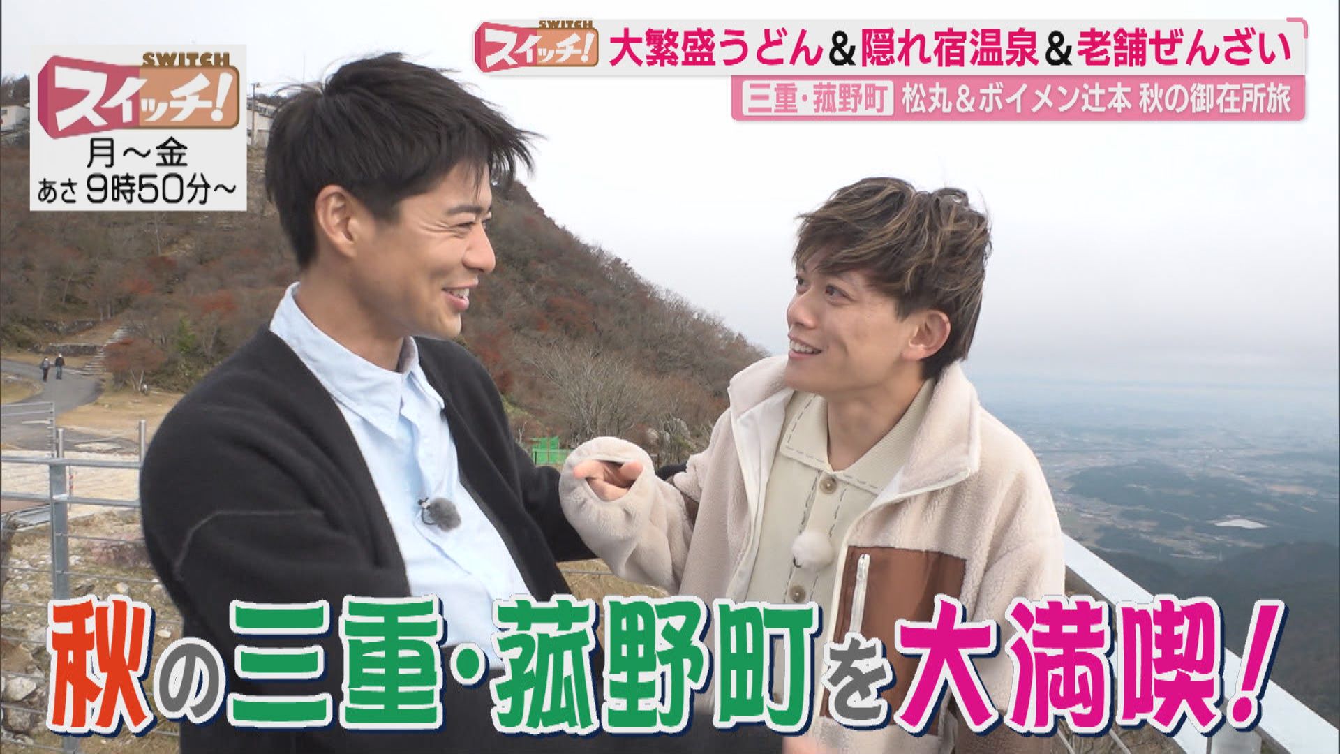●御在所ロープウエイ 【住所】三重県三重郡菰野町湯の山温泉 【電話番号】(059)392-2261 【営業時間】4~11月/午前9時~午後5時 ※11月30日(日)までの土日祝日は午前8時30分から営業開始 12~3月/午前9時~午後4時 【定休日】不定休(強風時運休) 12/9~12/23 まで運休 ●福村家 【住所】三重県三重郡菰野町福村421-1 【電話番号】(059)393-2968 【営業時間】昼/午前11時~午後2時 夜/午後5時~午後8時30分 ※麺がなくなくなり次第終了 【定休日】月・第3火 (※祝日の場合営業 翌日休み) ・カレーうどん ・エビチーズカレーうどん ・小ライス ●かもしか道具店 【住所】三重県菰野町川北2834-2 【電話番号】(059)327-6555 【営業時間】平日 午前10時~午後4時 土・日・祝 午前10時~午後5時 【定休日】年末年始 ・ごはんの鍋 ・なっとうバチ ・陶のフライパン ・うつわ作り体験 ※事前予約制 ●大昇軒 【住所】三重県菰野町竹成2073-6 【電話番号】(059)396-0513 【営業時間】 カフェ 午前10時~午後4時(L.O.午後3時30分) 店内販売 午前10時~午後5時 【定休日】月・火・水 ※月曜祝は営業 ※不定休あり ・ぜんざい ※ドリンクセットあり ・栗きんとん ●旅館 寿亭 【住所】三重県菰野町菰野8585 【電話番号】(059)392-2131 【営業時間】〈日帰り入浴〉 午前11時30分~午後3時 〈宿泊〉 チェックイン:午後3時 チェックアウト:午前10時 【定休日】不定休 〈日帰り入浴〉12月3日~5日 12月15日~17日は休み 〈宿泊〉12月3日・4日 12月15日・16日は休み ※情報内容は放送当時のものです 出演:辻本達規(BOYS AND MEN) 松丸亮吾