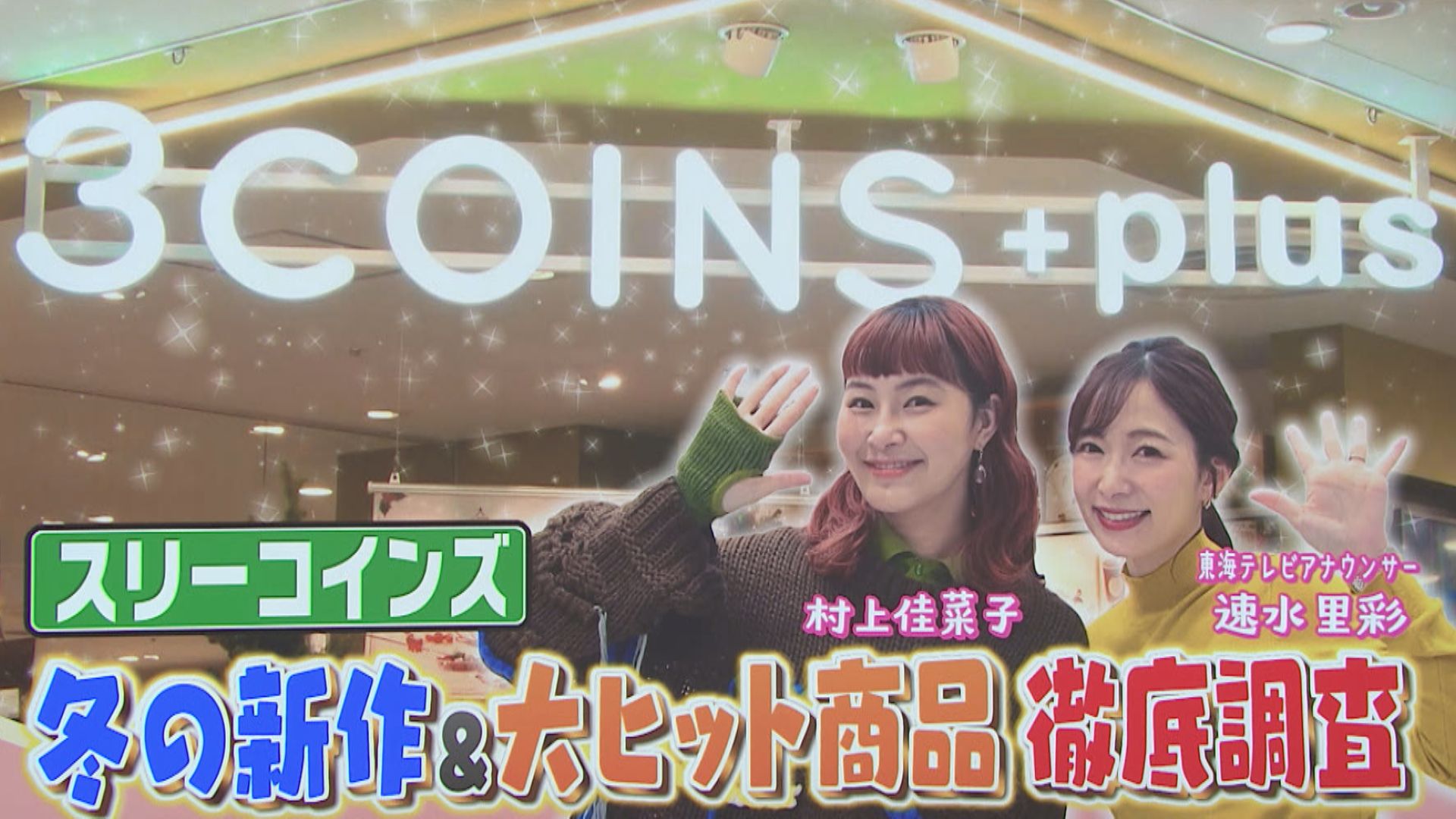 ●3COINS+plus メルサ栄店 【住所】名古屋市中区栄3-4-5 メルサ栄本店4F 【電話番号】(052)265-6779 【営業時間】午前10時~午後8時 【休業日】メルサ栄本店に準ずる ※情報内容は放送当時のものです 出演:村上佳菜子 速水里彩(東海テレビアナウンサー)