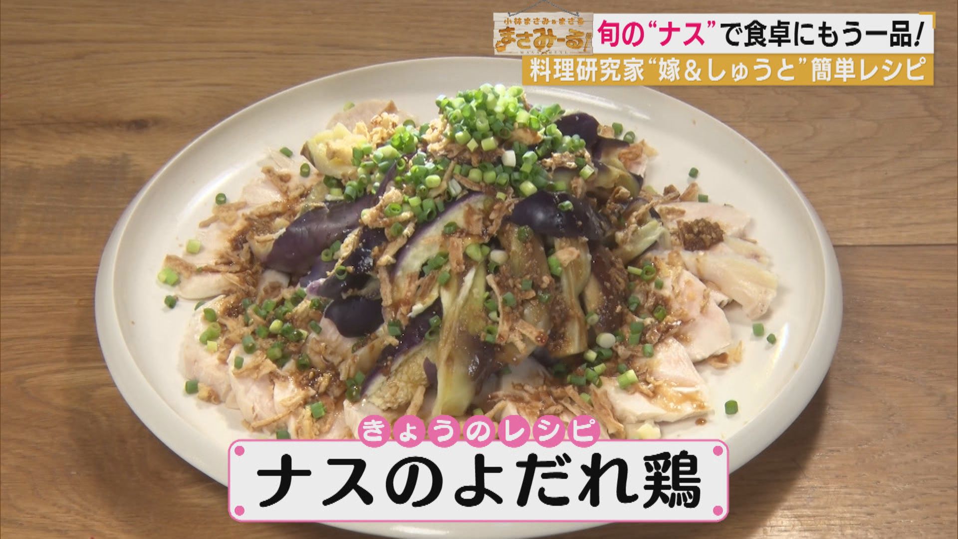 <ナスのよだれ鶏>(まさみ) 【材料(2~3人前)】 ・ナス 3個 ・鶏むね肉 1枚(250g) ・塩 小さじ1/3 ・水 600ml ・酒 大さじ2 ・長ねぎ 1本 ・しょうが(薄切り) 2枚 ・醤油 大さじ1 ・黒酢 大さじ1 ・おろししょうが 小さじ1 ・砂糖 小さじ1 ・白すりごま 小さじ1 ・粉山椒 2つまみ ・ラー油 小さじ2/3 ・フライドオニオン 1袋(10g) ・万能ねぎ 3本 【作り方】 ①鶏むね肉は水気を拭き、両面塩を振ってもみこみ、室温に約20分置く ②ナスは皮むき器で3か所皮をむき、ヘタを切り落とす 水にくぐらせ、耐熱皿にのせ、ふんわりラップをかけて600Wの電子レンジで約4分加熱する ③鍋に水・酒・長ねぎの青い部分・皮ごと薄切りにしたしょうが・①の鶏むね肉を入れ強火にかけはじめる 一煮立ちしたら火を止め、ふたをして4〜5分置く 4~5分たったら、鶏むね肉を裏返して、さらにふたをして4〜5分置く ※鶏むね肉の厚い部分に竹串を刺し、透明の汁が出て火が通ったらOK! ④②のナスと③の鶏むね肉を冷蔵庫で約2時間冷やす ⑤ボウルに醤油・黒酢・おろししょうが・砂糖・白すりごま・粉山椒・ラー油を混ぜ合わせる ⑥④の冷えた鶏むね肉を薄いそぎ切りにしてお皿に盛り、ナスを手でさき、上にのせる ⑦フライドオニオンをのせ、⑤のタレをかけ、小口切りにした万能ねぎをのせたら完成 ※情報内容は放送当時のものです 出演:小林まさみ(料理研究家) 小林まさる(シニア料理研究家)(90)