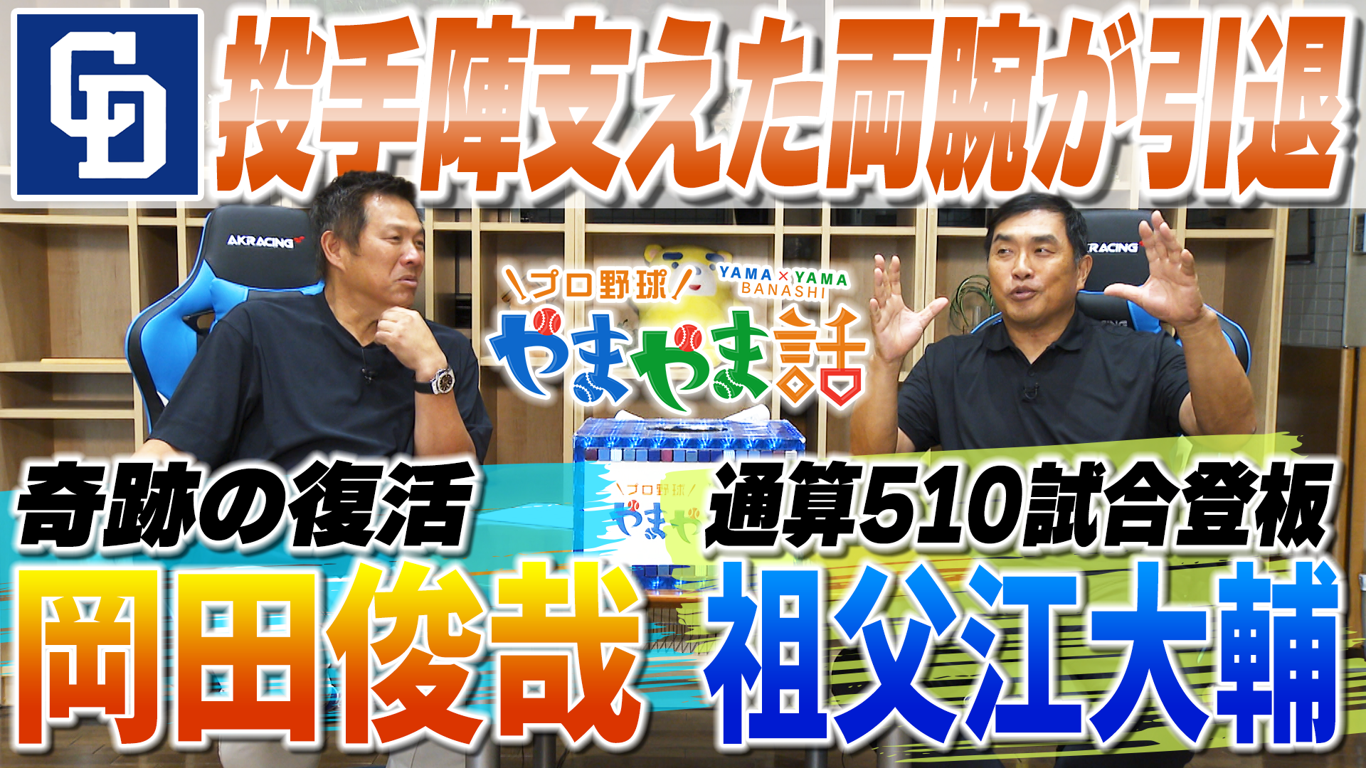 ドラフトで新たな出会いがあれば、一方で避けられない別れあり… 今回はともに今シーズン限りでユニフォームを脱ぐことになった、岡田俊哉・祖父江大輔両投手の思い出をやまやまコンビのお2人が語り尽くします。 ドラゴンズ一筋16年の岡田投手は、 おととし沖縄キャンプ中に右足の大腿骨を骨折。 「生きていることさえ奇跡」と言われた大ケガから、今年一軍で復活登板を果たしました。 そして祖父江投手は、愛知高-愛知大-トヨタ自動車という経歴の、まさにご当地選手。 プロ生活12年目の今シーズン、球団史上5人目の通算500試合登板を達成。 どんな状況でも登板することを厭わない、 首脳陣にとっては使い勝手のいいピッチャーでした。 惜しまれながらユニフォームを脱ぐ功労者2人に、 山本昌さんと山﨑武司さんからは感謝の言葉と今後へのエールも贈られます!