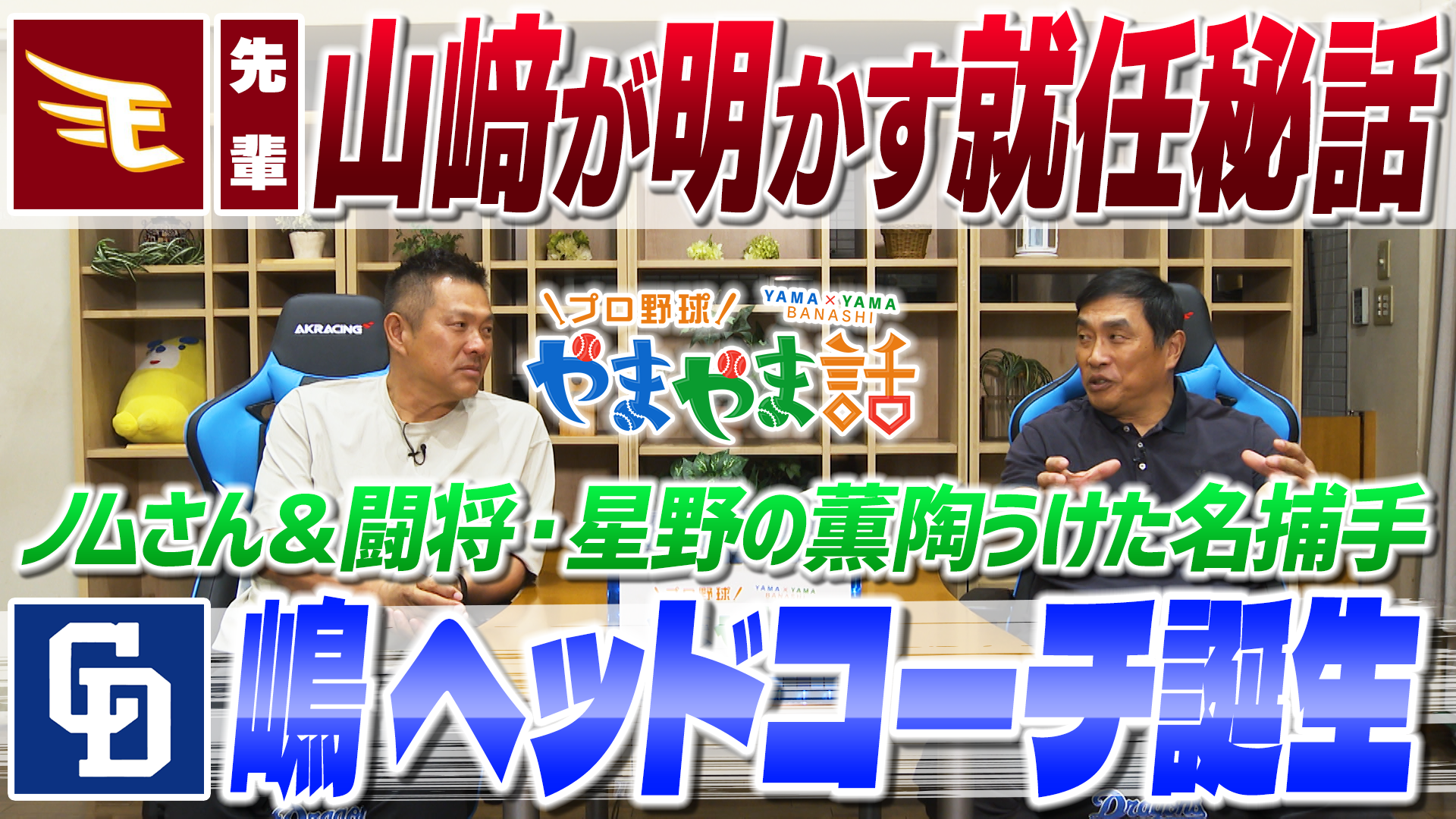 井上竜に不在だったヘッドコーチのポジションに、 岐阜・海津市出身で高校は中京大中京という、地元が生んだ名捕手・嶋基宏氏が就任! 現役時代は楽天で野村克也・星野仙一両監督の薫陶を受け、 リーグ優勝と日本一にも輝いたほか、日本代表として国際試合にも出場。 直近2シーズンは、ヤクルトのヘッドコーチとしてドラゴンズと戦ってきました。 経験・実績とも申し分ない人選ですが、就任にあたっては、 楽天時代の先輩・山﨑さんだからこそ知る秘話が…